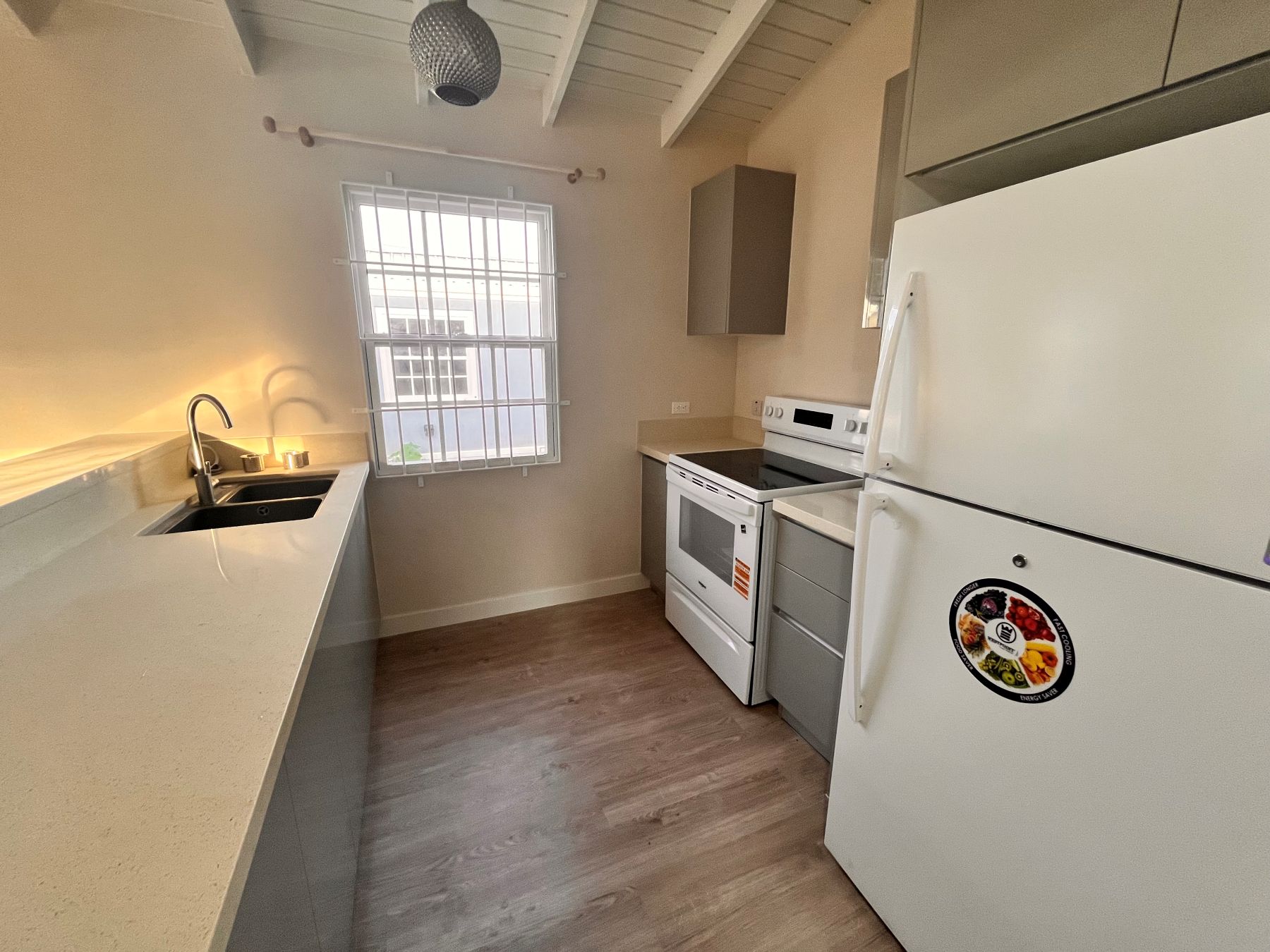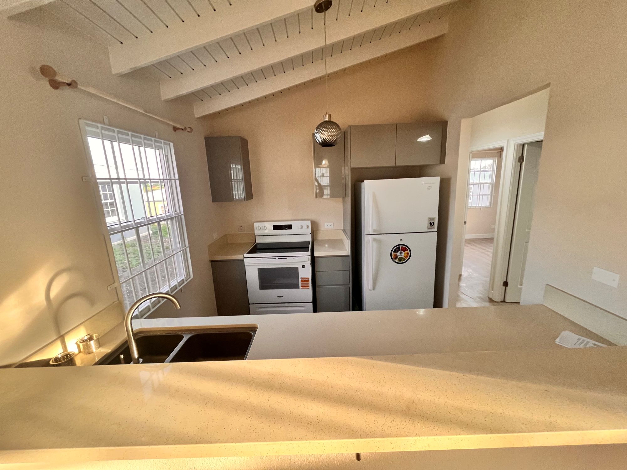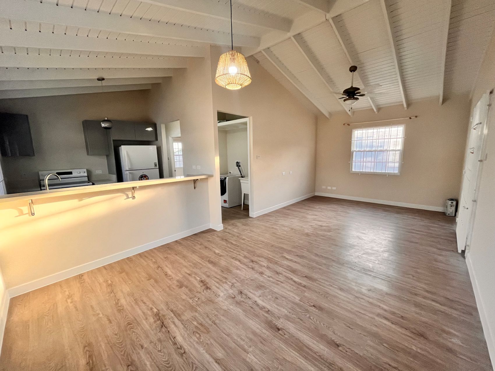 You enter through the patio into a spacious bright and airy living and dining space, complete with ceiling fan for added comfort. A well-equipped kitchen featuring a stove, fridge and a convenient high bar perfect for morning chats over breakfast.