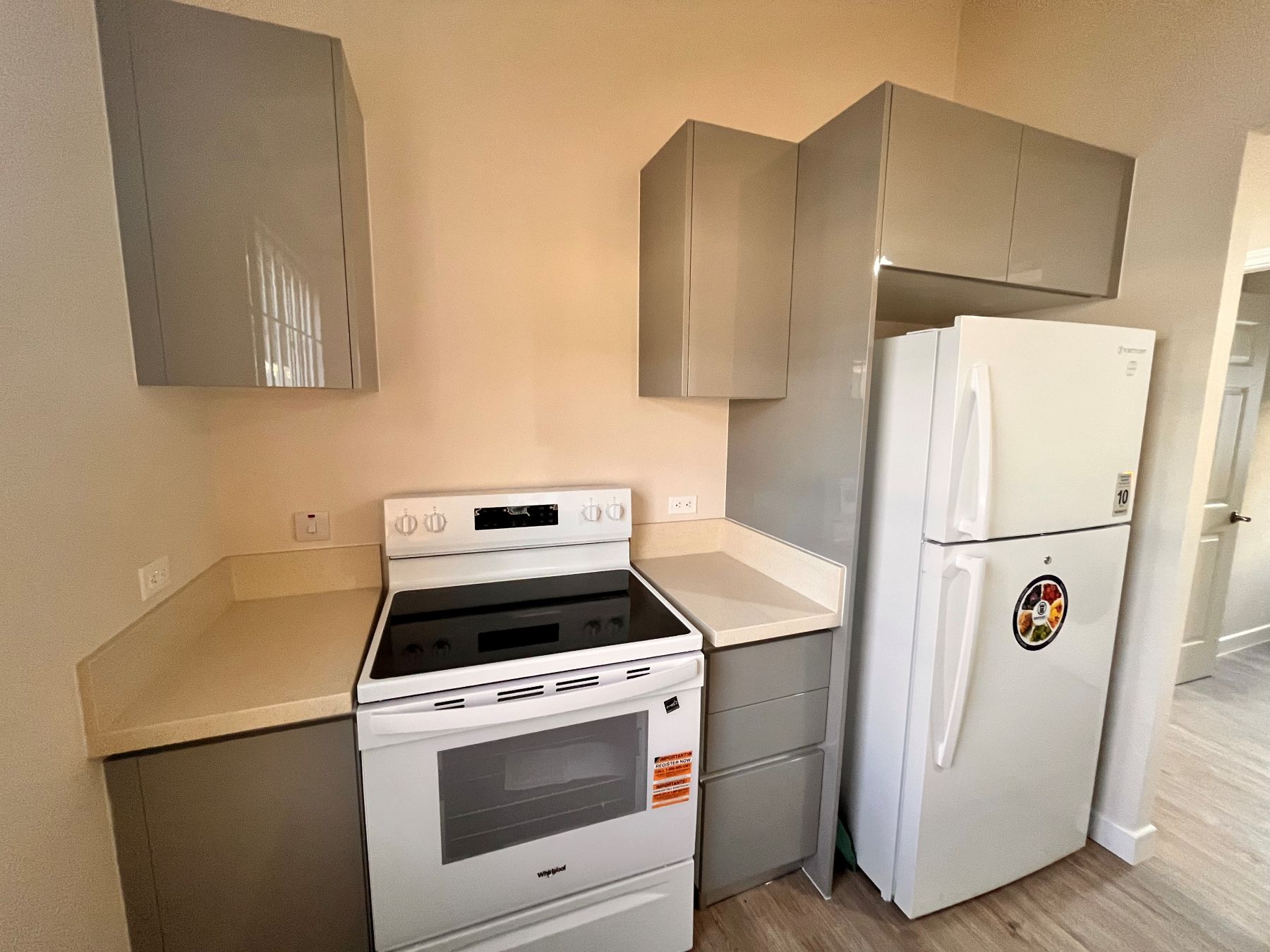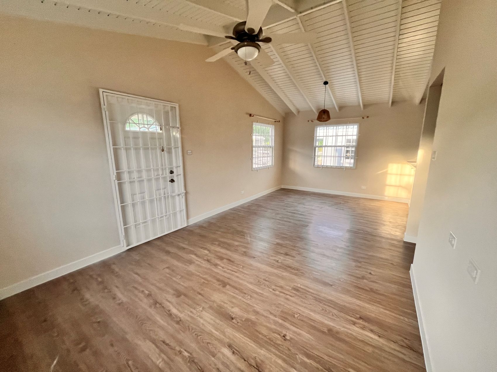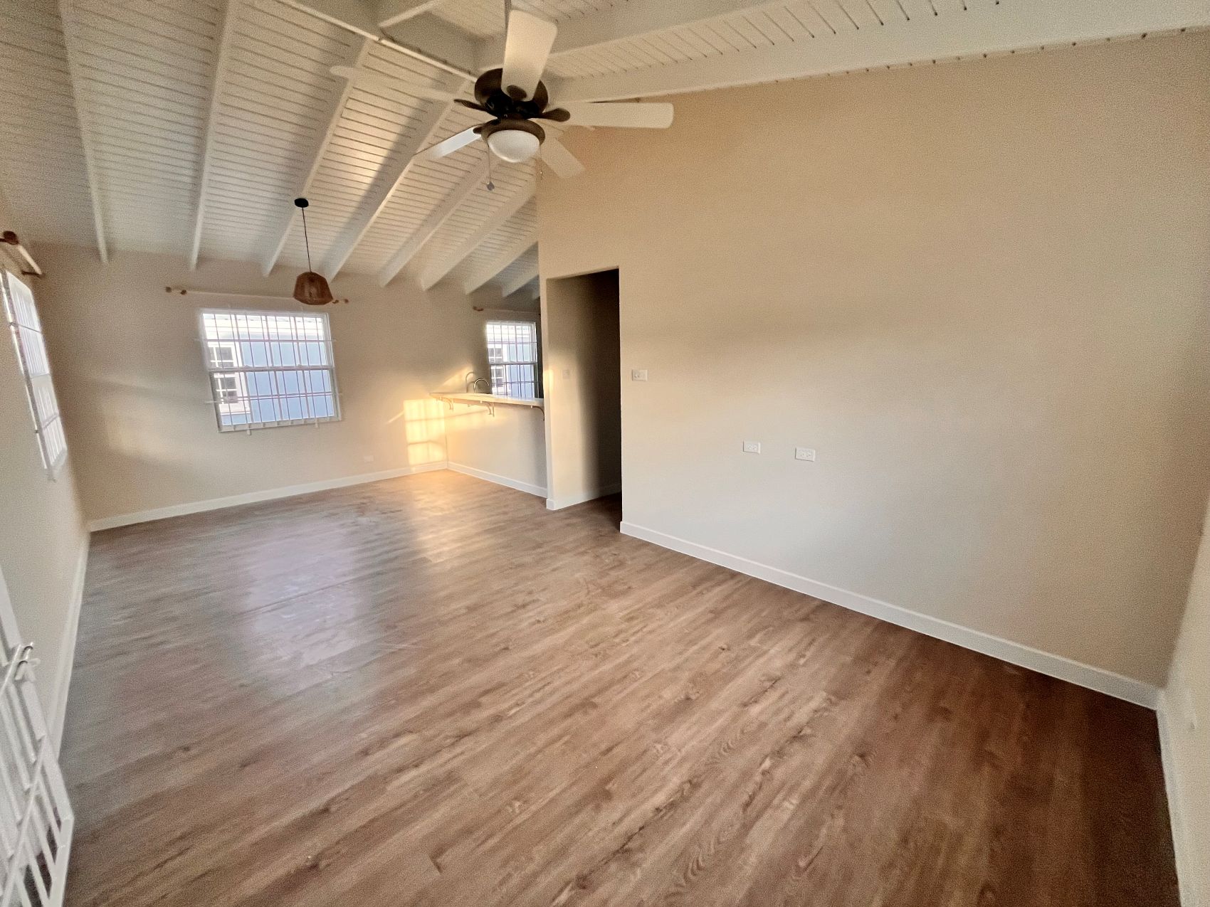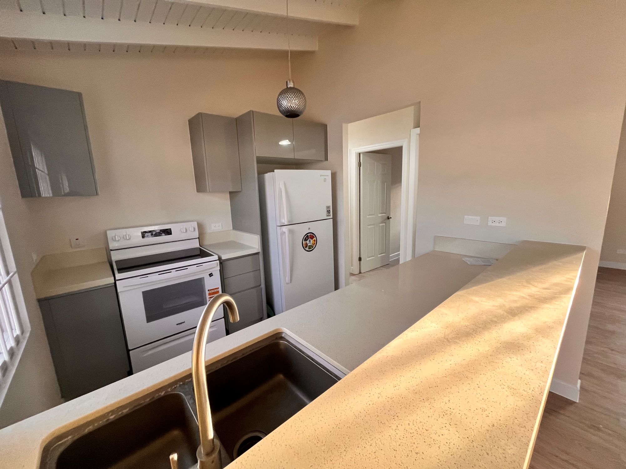 You enter through the patio into a spacious bright and airy living and dining space, complete with ceiling fan for added comfort. A well-equipped kitchen featuring a stove, fridge and a convenient high bar perfect for morning chats over breakfast.