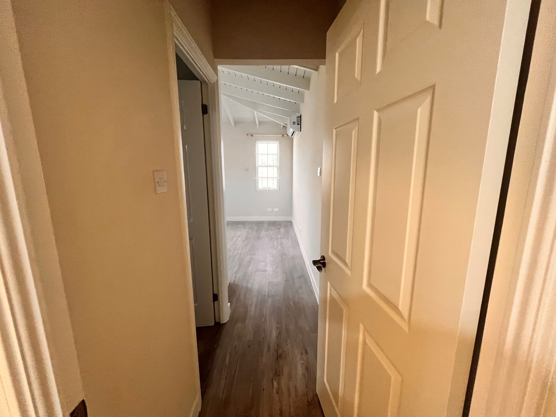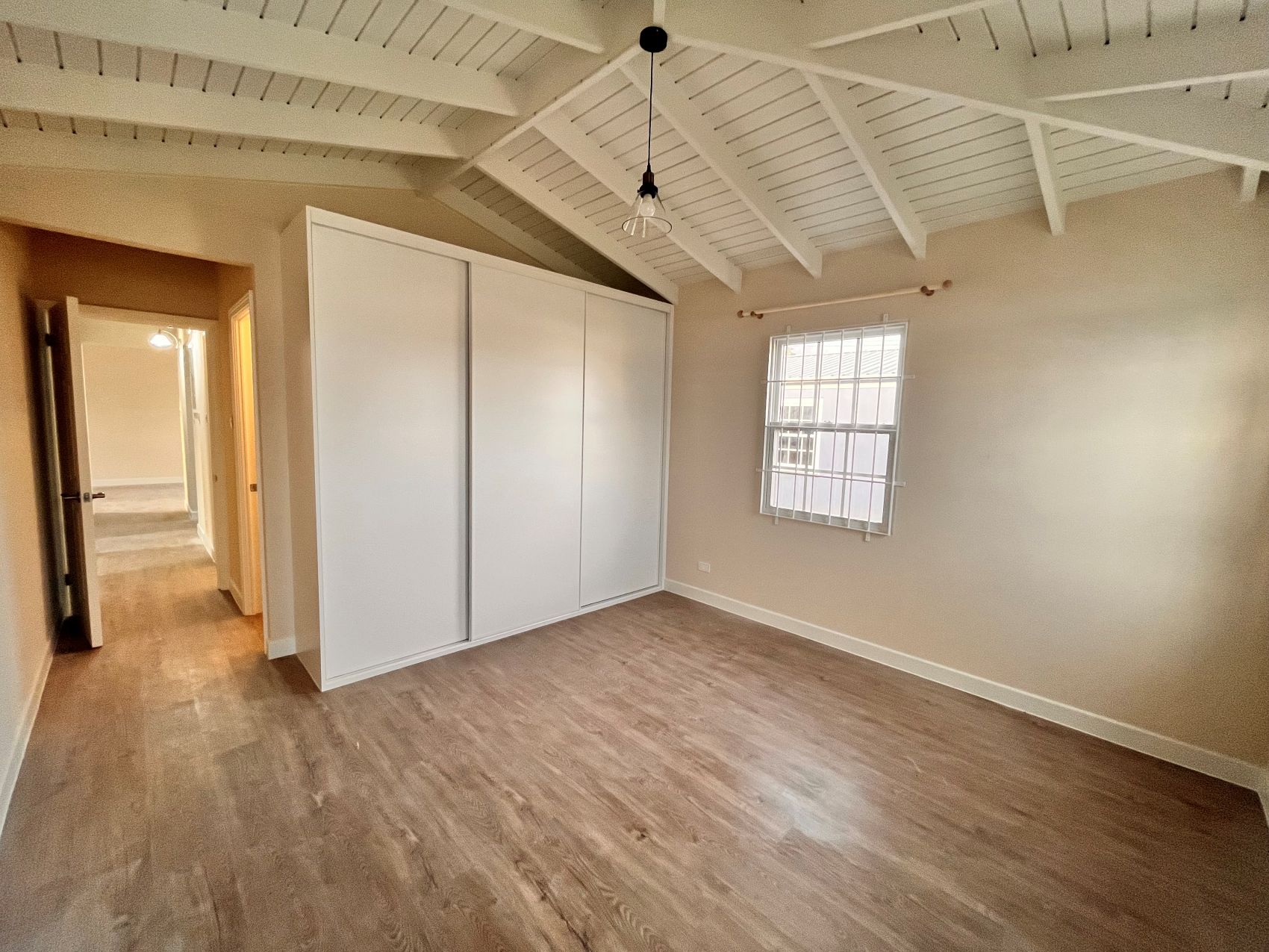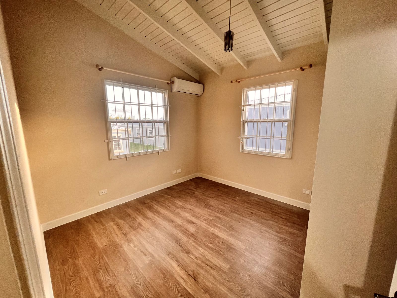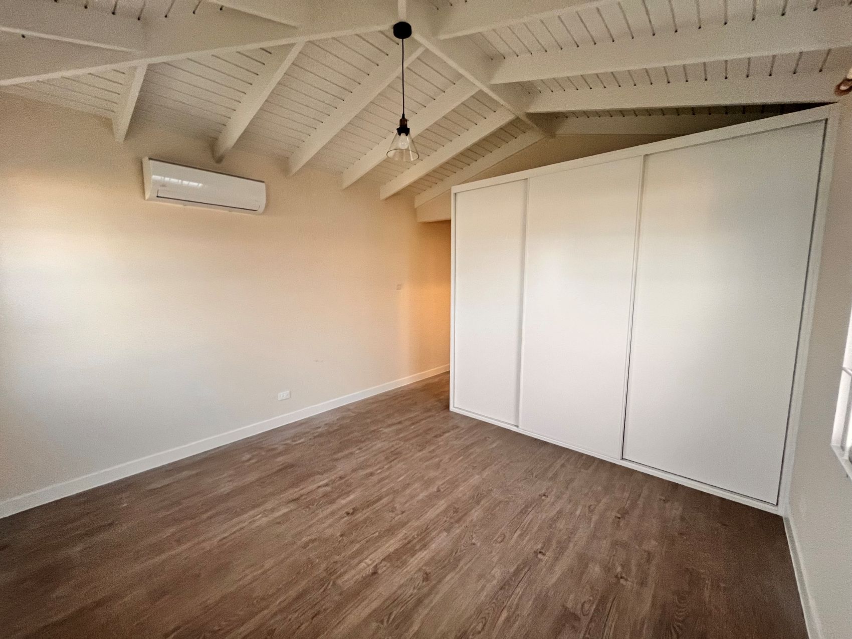 At the back there is the primary suite which offers a peaceful retreat with its own ensuite bathroom with shower and AC. On the right there is the second bedroom which is spacious with built in wardrobes and AC. There is also another bathroom with shower and modern fixtures.