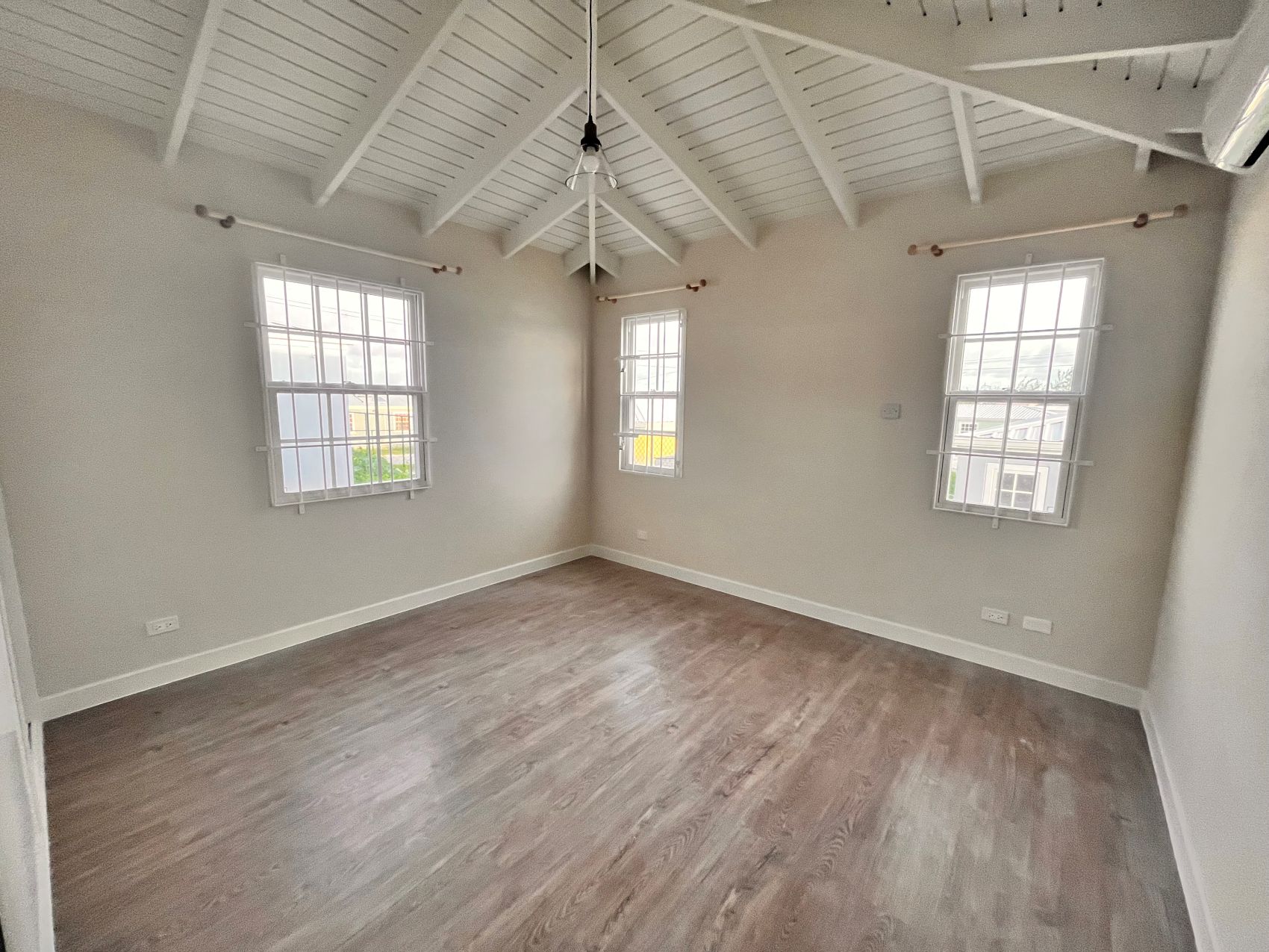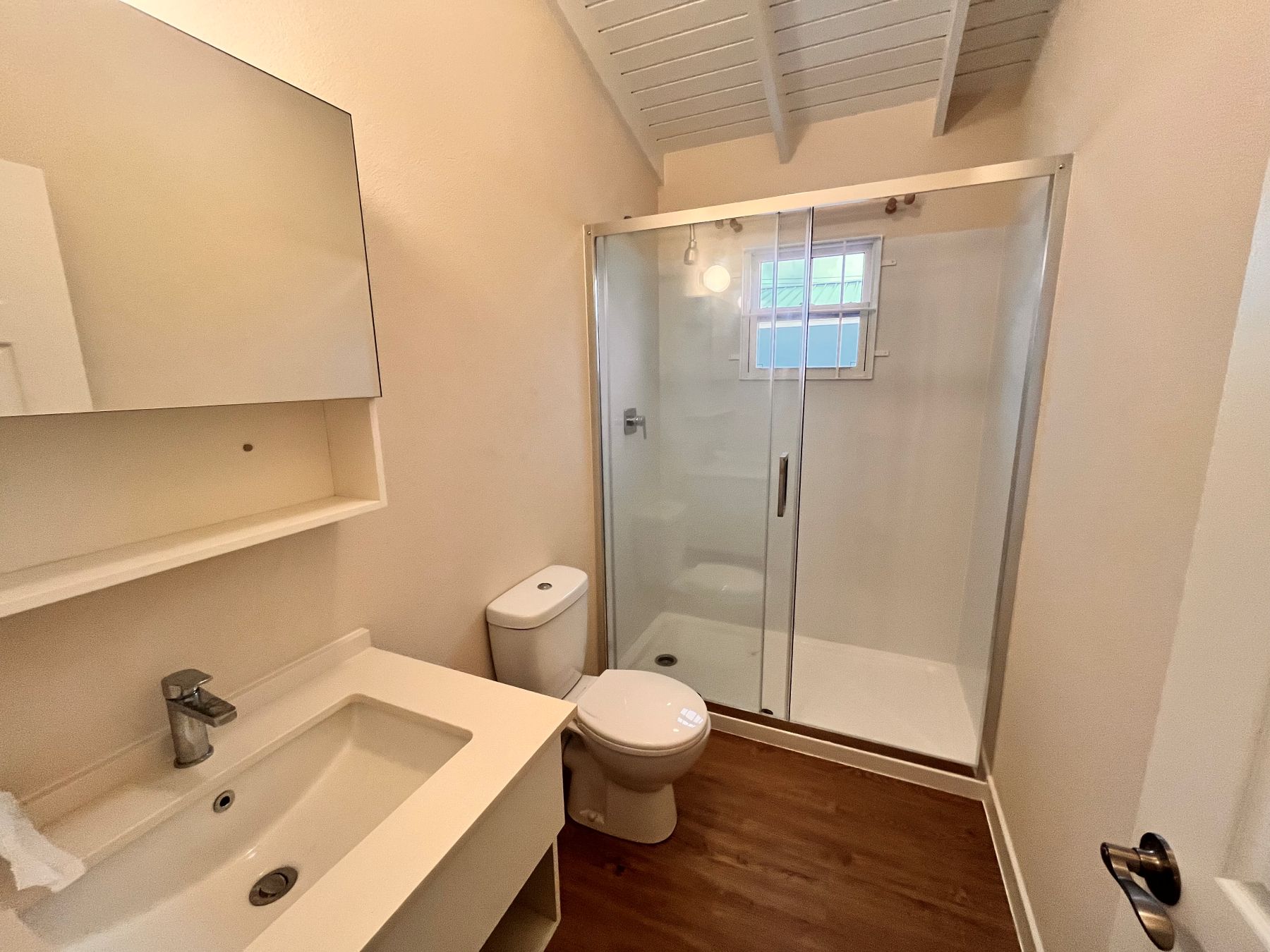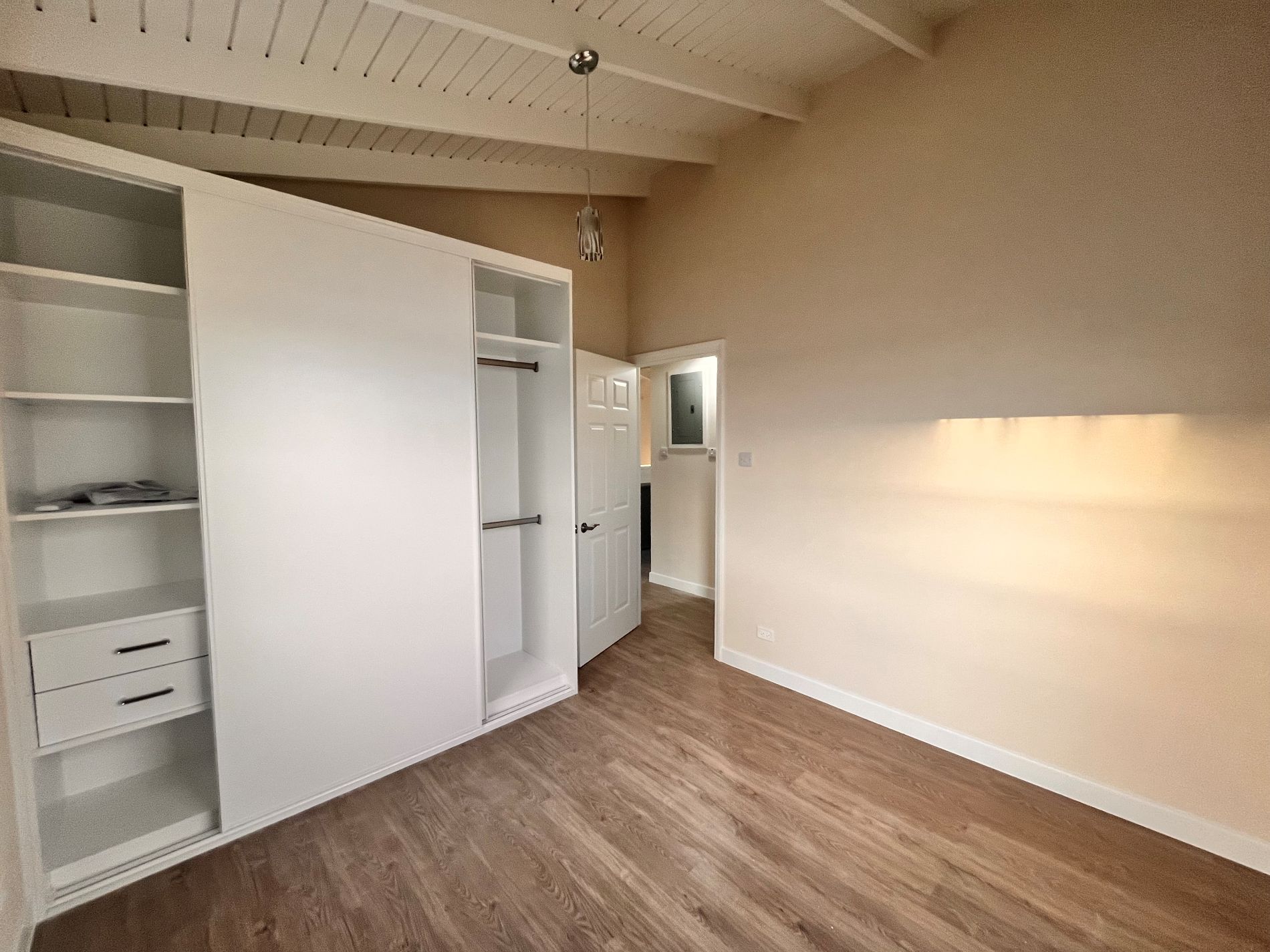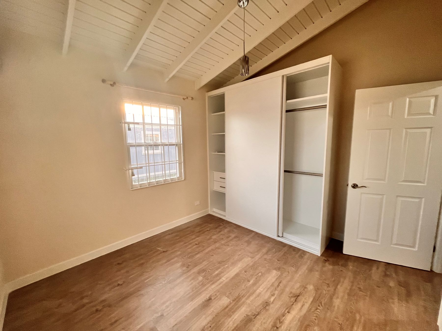 At the back there is the primary suite which offers a peaceful retreat with its own ensuite bathroom with shower and AC. On the right there is the second bedroom which is spacious with built in wardrobes and AC. There is also another bathroom with shower and modern fixtures.