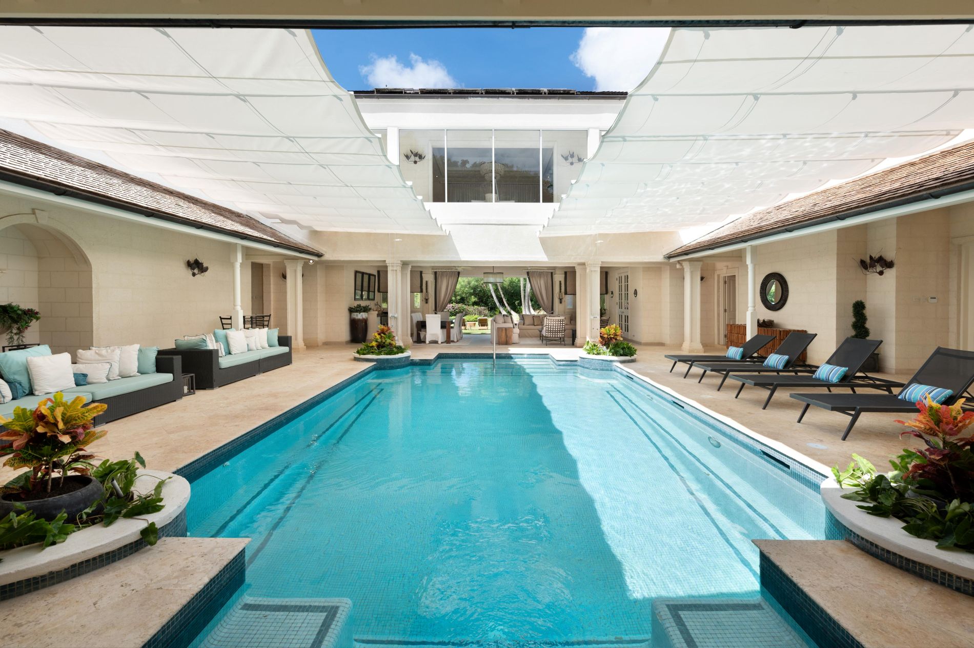 Private indoor swimming pool with retractable canopy.